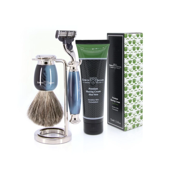 Created by highly acclaimed manufacturer of quality men’s wet shaving accessories Edwin Jagger, this bestselling shaving set is finished, branded and filled in Sheffield using durable imitation blue horn polyester material, with bright nickel plating.