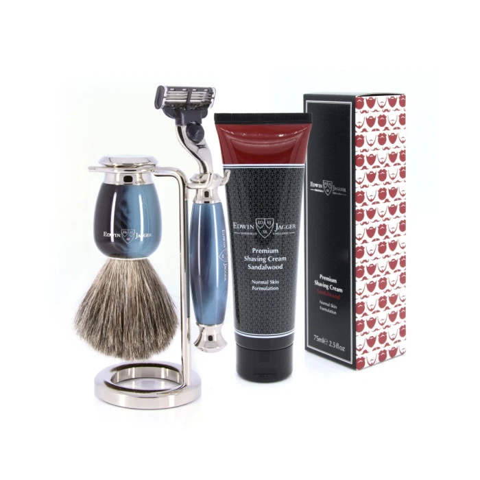 Created by highly acclaimed manufacturer of quality men’s wet shaving accessories Edwin Jagger, this bestselling shaving set is finished, branded and filled in Sheffield using durable imitation blue horn polyester material, with bright nickel plating.
