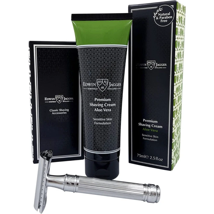 The accompanying Edwin Jagger Aloe Vera Shaving Cream is a soothing and natural preparation with a refreshing and delicate fragrance. Formulated for those with sensitive skin in mind, it harnesses the natural properties of aloe vera plants to calm and refresh the skin during shaving.Â