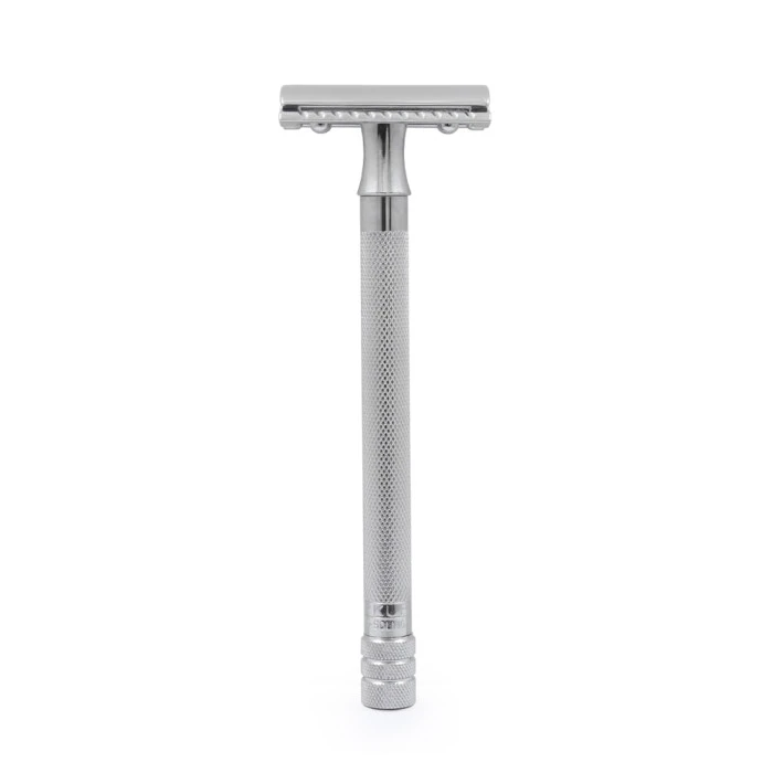 The three-part razor head is less aggressive than the ones found on other Merkur razors, making it ideal for all types of skin. The two head plates screw into place with the beautifully designed knurled handle and are finished in a gleaming durable and corrosion resistant chrome.