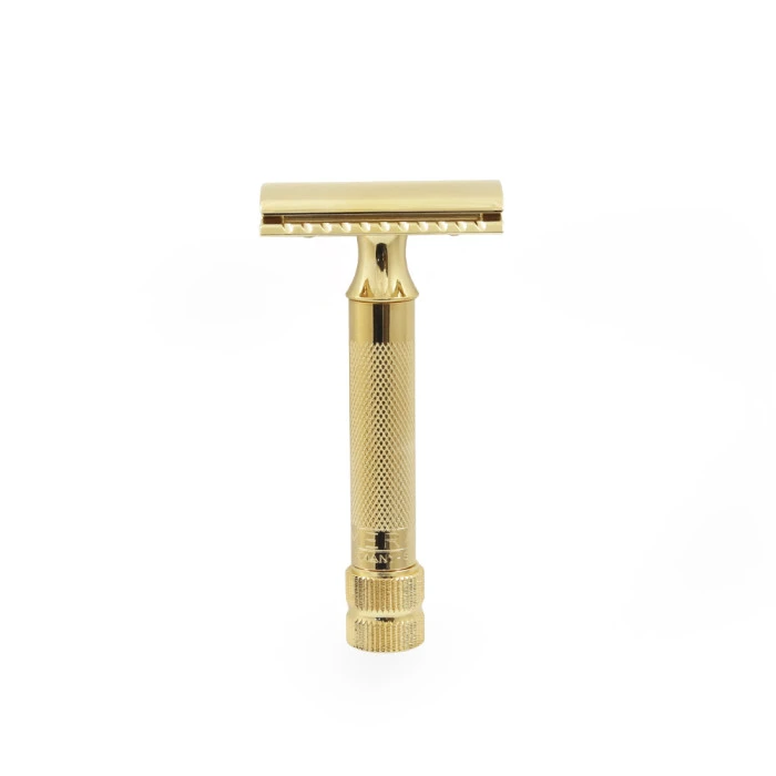 Merkur 34G Gold DE Safety RazorĀ is a gold plated double edge safety razor in one of the most popular Merkur designs, the 34C. Its gold plated handle features knurled engraving for improved grip. The razor head, collar and end cap are also finished with polished gold. Also features engraved Merkur branding at the base of the handle. This is a two piece razor where the top plate can be separated for easy blade insertion and razor maintenance.