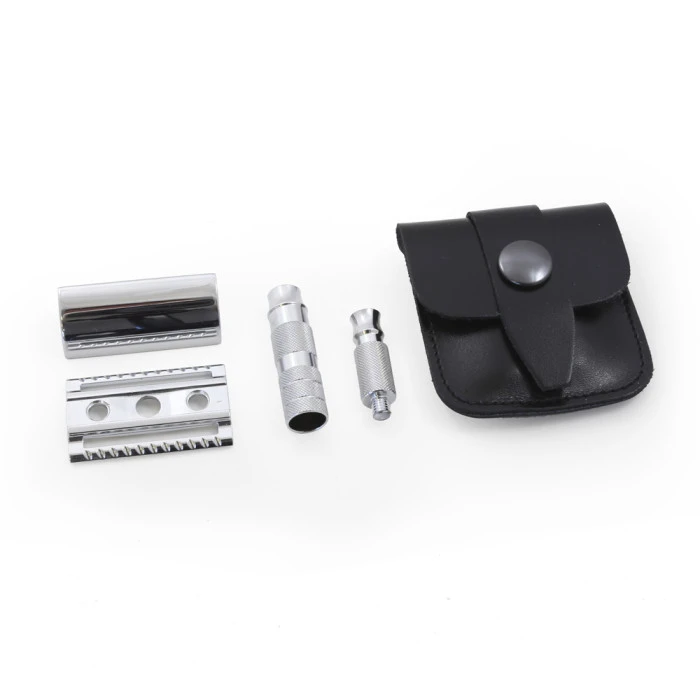 Merkur 933C Travel Razor in Leather Case is a chrome plated double edge safety razor perfect for travel. Its polished chrome handle is features fine knurling for enhanced grip and an attractive finish. The razor head and collar are also finished with polished chrome. This is a four piece razor where the top plate and base plate can be separated for easy blade insertion, and the handle breaks down into two pieces. All of the component parts fit neatly into a pop-stud fastened leather travel pouch which fits neatly into any washbag. A smart, stylish, portable razor offering the famous Merkur shave.