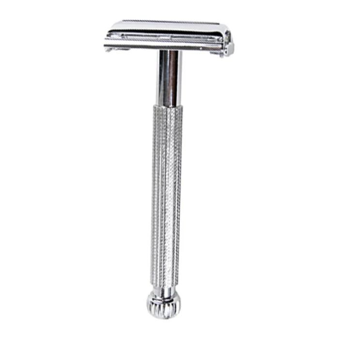 The razor is crafted from chrome plated brass for durability. The attractive long, thin handle design features a stylish engraved pattern, giving the razor an aesthetically pleasing appearance and enhanced wet grip.